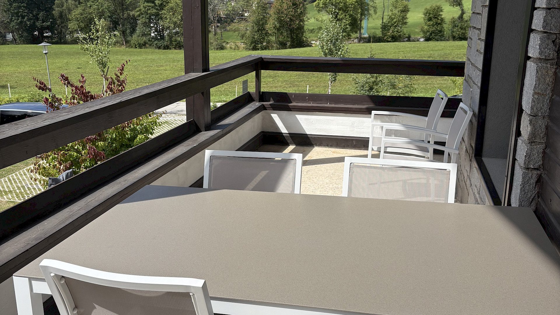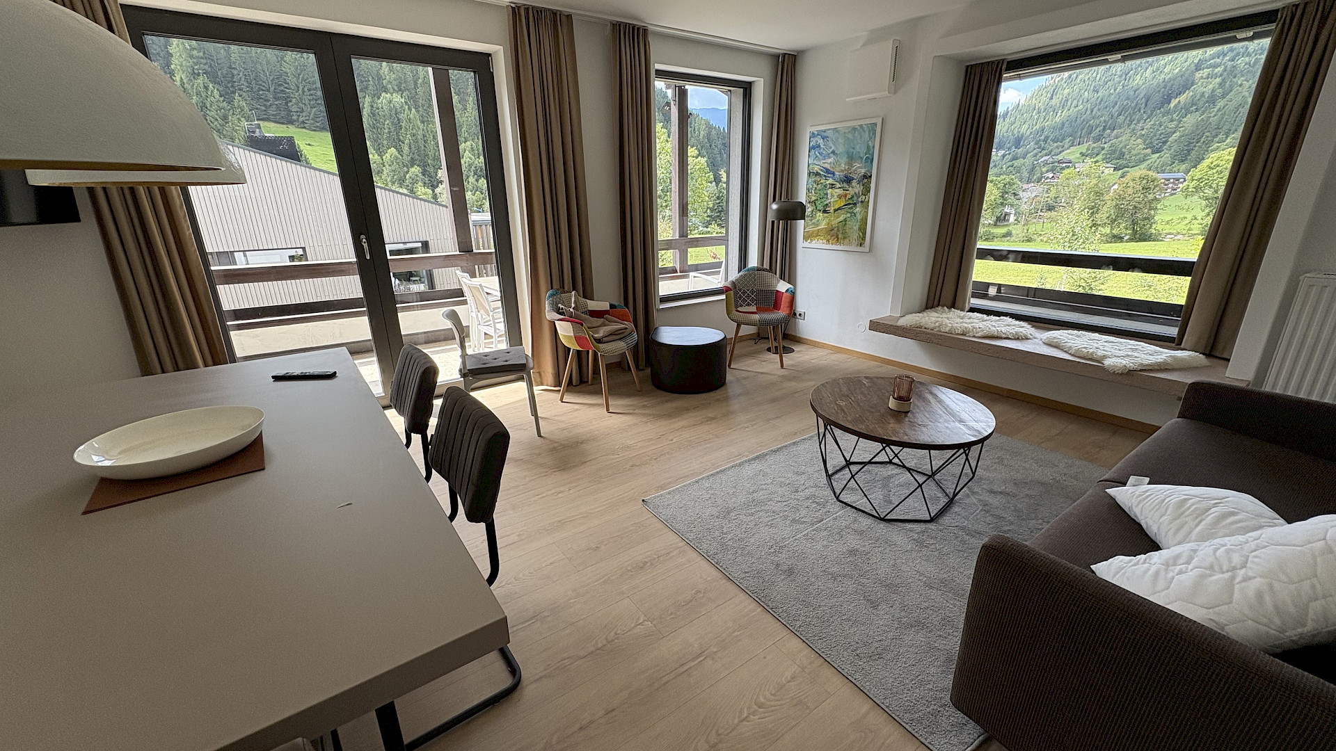 Durch die Panoramafenster und die großen Balkone in Ost-, Süd- und Westrichtung genießen Sie Sonne von früh bis spät – und einen herrlichen Blick auf die umliegenden Nockberge.